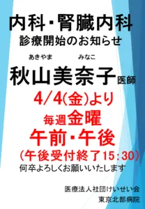 4月4日より 毎週金曜日 内科・腎臓内科 秋山美奈子先生の診察開始となります。