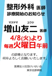 4月8日より 毎週火曜午前 整形外科 増山友二先生の診察開始となります。