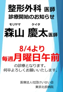 8月4日より 毎週月曜終日 整形外科 森山慶太先生の診療開始となります。